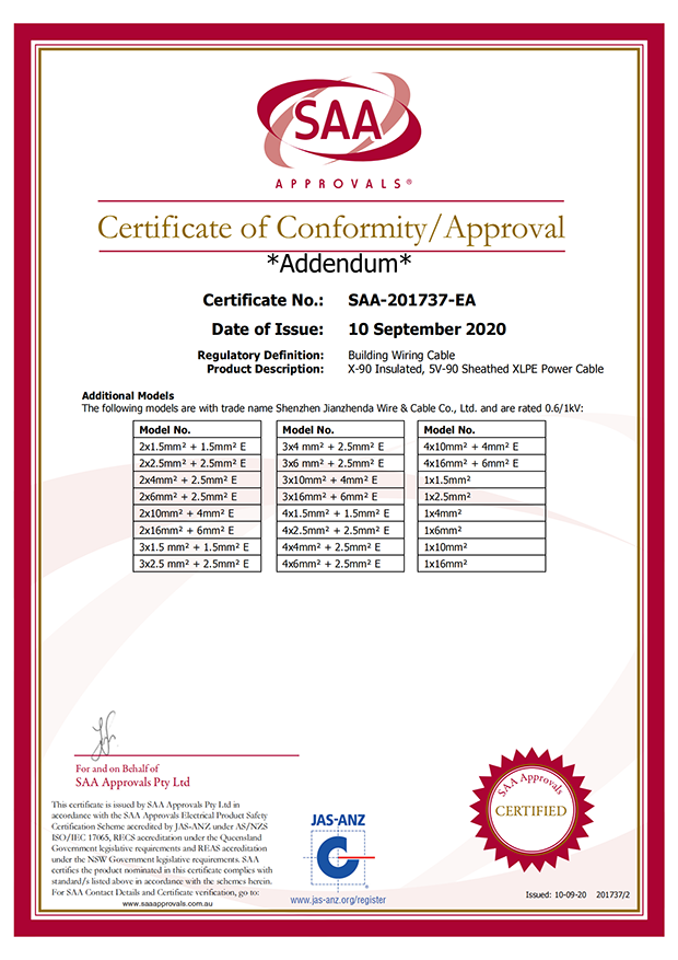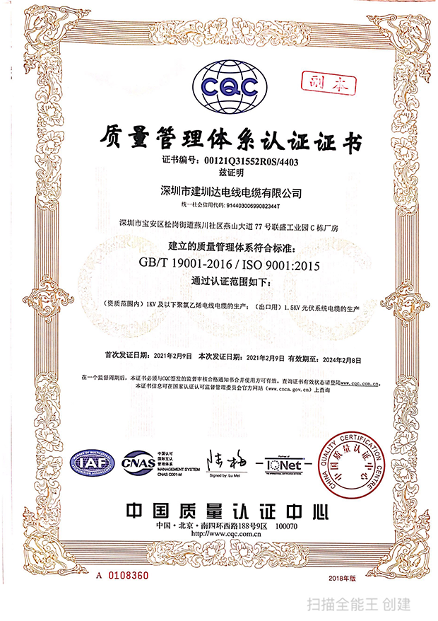 深圳建圳達(dá)電線電纜有限公司,成立于2000年,是一家電線電纜制造商,我們通過了世界各地不同市場(chǎng)的多數(shù)認(rèn)證,如:CCC、RoHS、CB、SAA、TUV、VDE、PSE、BPS、UL、CSA。我們根據(jù)定制產(chǎn)品不斷更新新的認(rèn)證。經(jīng)過數(shù)十年的發(fā)展,我們與來自世界各地的客戶建立了長(zhǎng)期的合作關(guān)系。我們?cè)?jīng)是菲律賓機(jī)場(chǎng),,柬埔寨的電力站,美國的醫(yī)院,工廠,埃塞俄比亞的水電站項(xiàng)目。我們是一家值得信賴的電線供應(yīng)商。